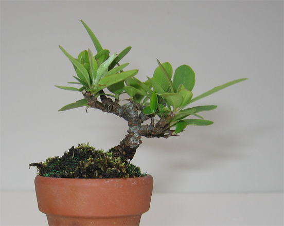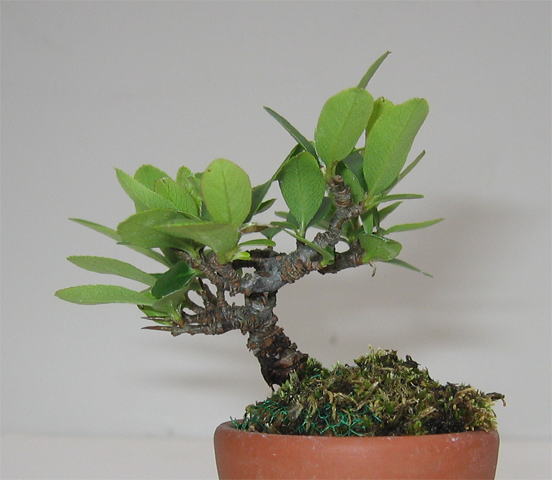 2007/05/17 ピラカンサミニ 8鉢仕入れた中で上の部に入る5鉢は頒布コーナーへ あまりの3鉢の中の一鉢を18ヶ月の間にしっかりと見せ場を作ります ピラカンサは樹勢が強壮で萌芽力も強いのでミニ向きの樹種 切り込みと針金を併用して樹格の向上を目指します