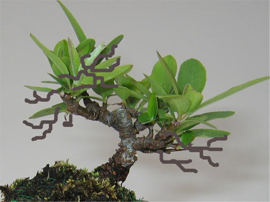かなり器用に模様の入った幹筋です その幹模様のイメージにしっくりとした枝を作ることが、木作りの大切なポイントになります 枝作りのイメージ図 後ろ姿 次回の手入れ後の姿を楽しみにお待ち下さい
